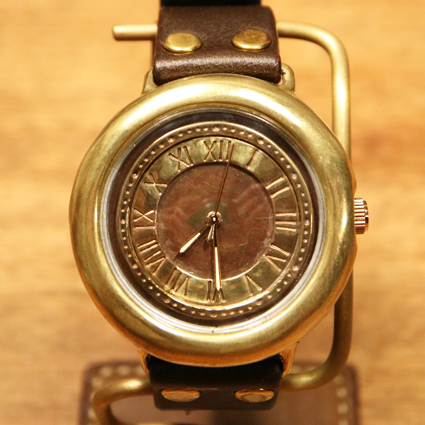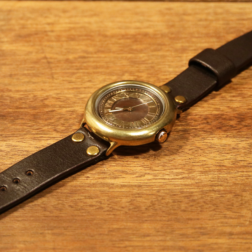 丸みのあるドーナツ型ケースが特徴。 いぶし、焼き入れ、磨きなどにより、色々な真鍮の色合いを出しています。
