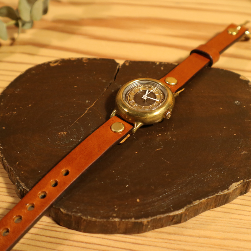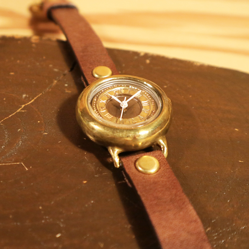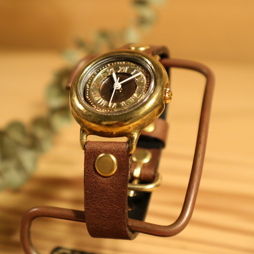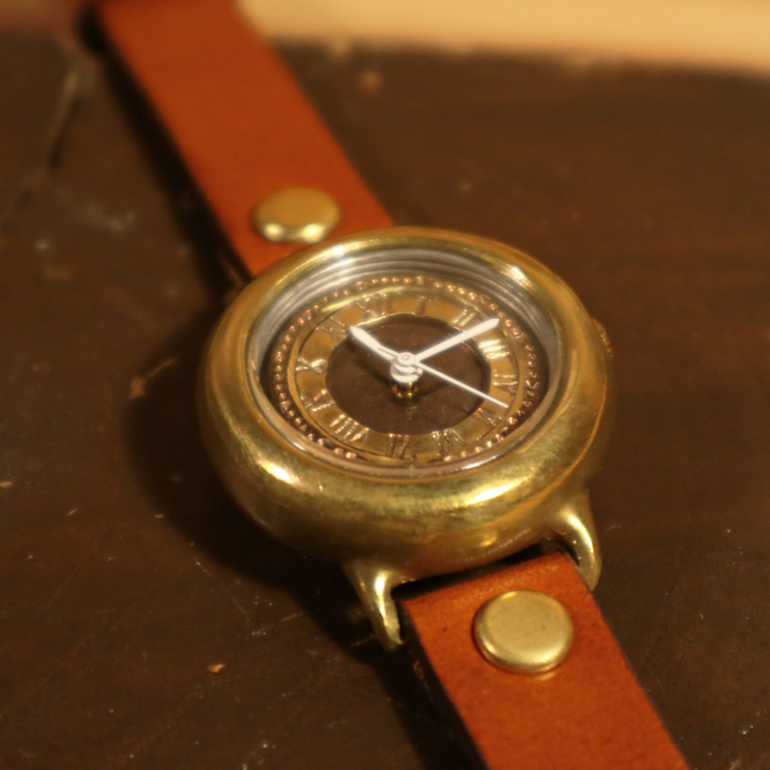 丸みのあるドーナツ型ケースが特徴。 いぶし、焼き入れ、磨きなどにより、色々な真鍮の色合いを出しています。