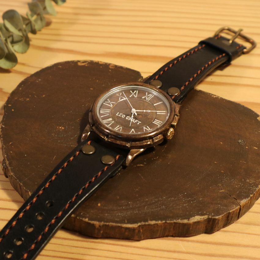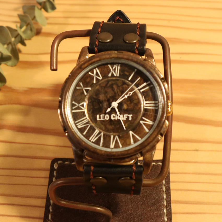 真鍮に染めや焼き入れ等様々な加工を施し、淡い模様を付けた時計です。