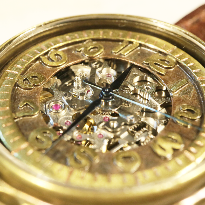 ムーブメントの動きが表からも裏からも見えるスケルトン・シースルーバック仕様。