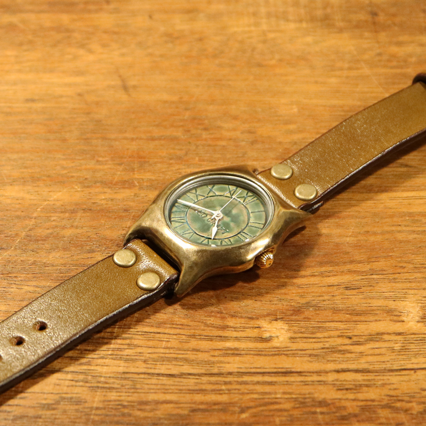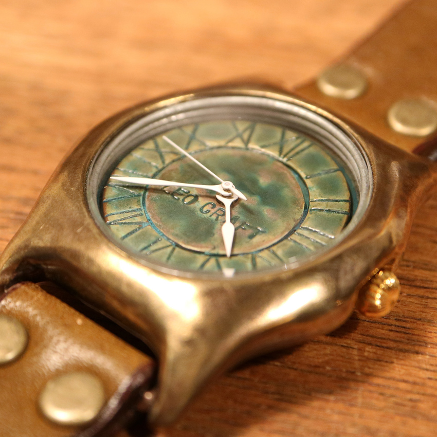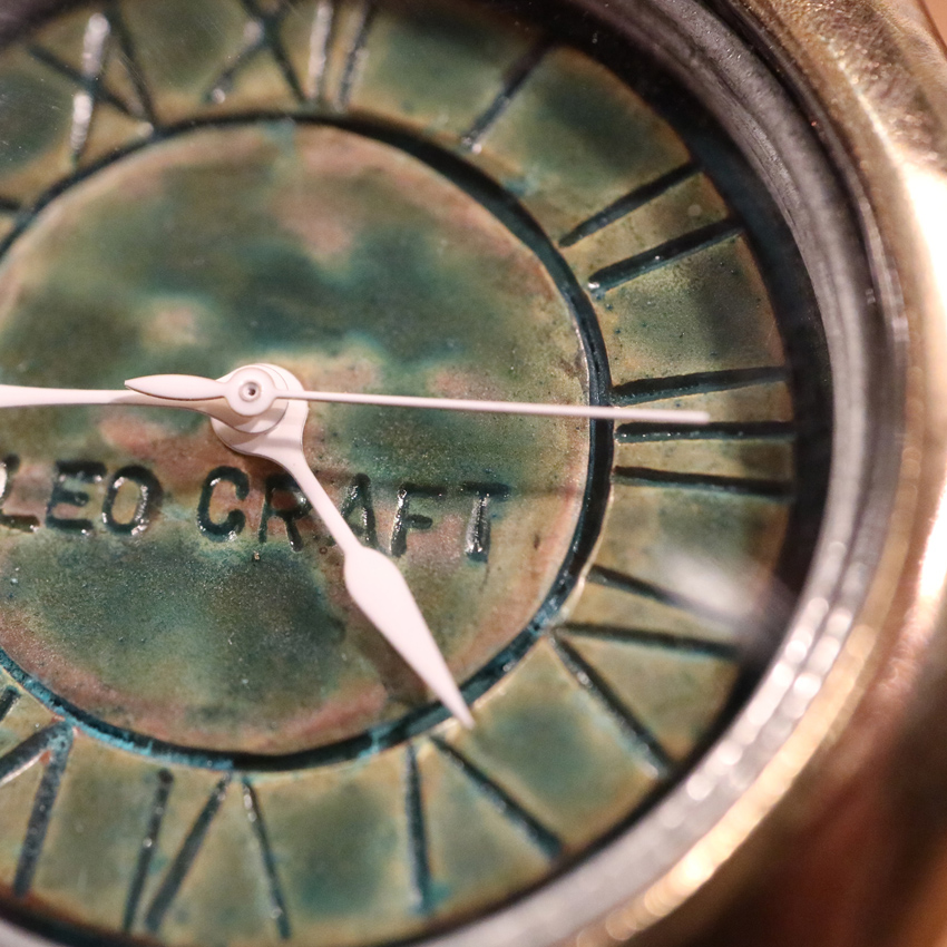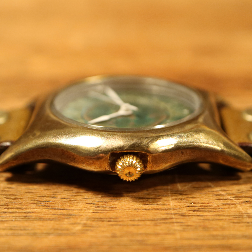 意図的に真鍮のサビ(緑青)を発生させ、色付けした時計。、