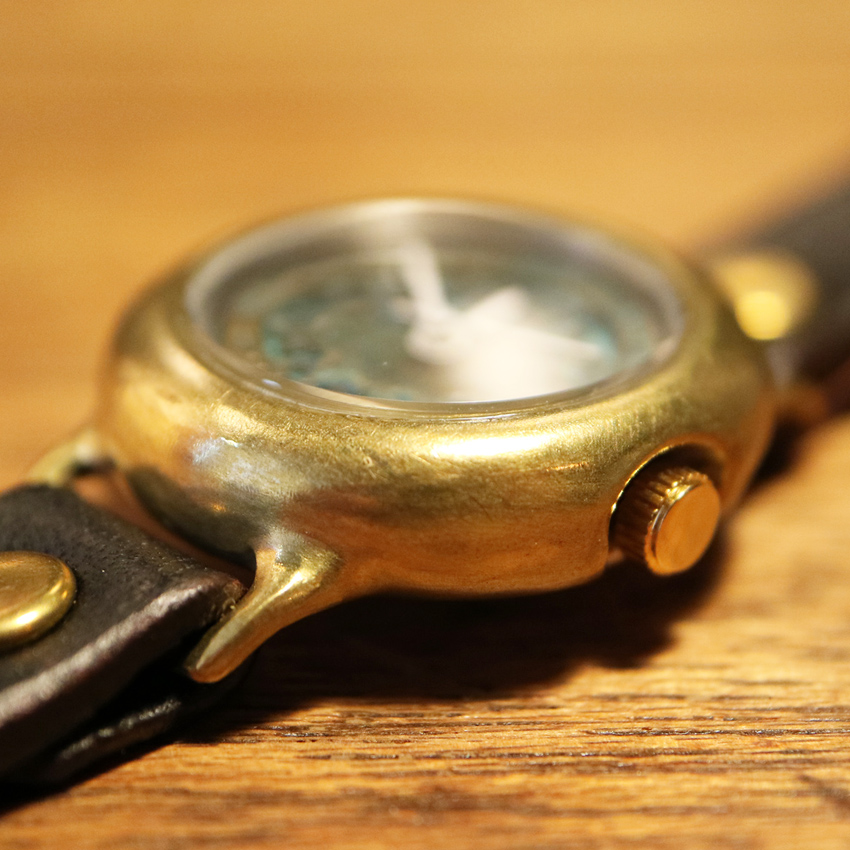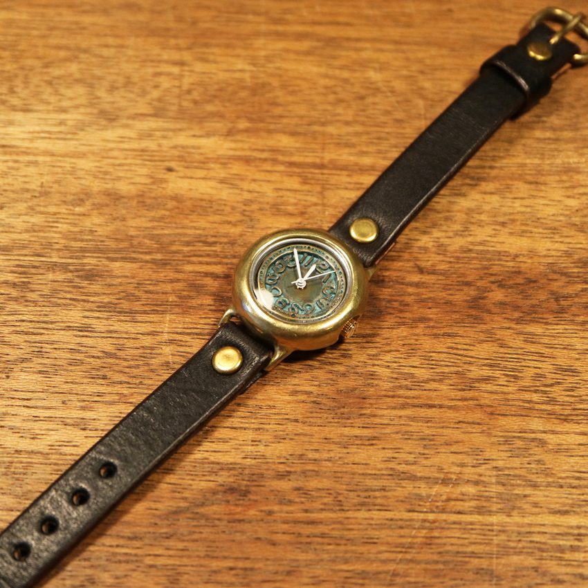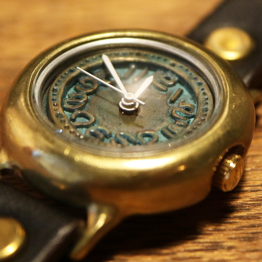 意図的に真鍮のサビ(緑青)を発生させ、色付けした時計。