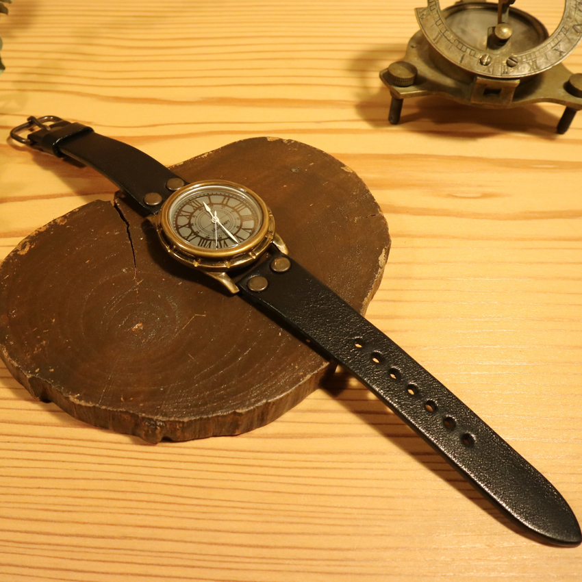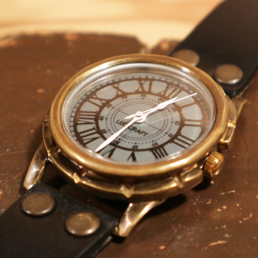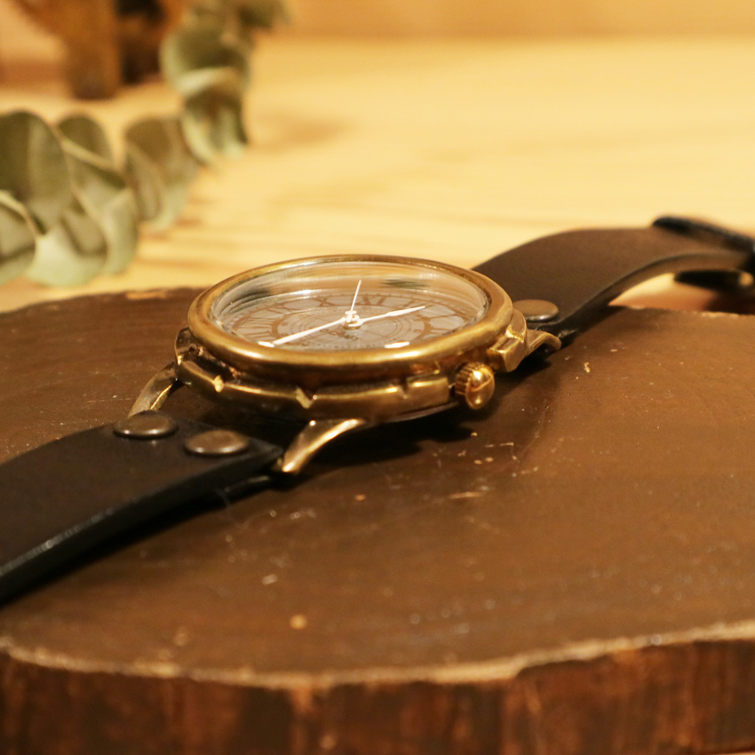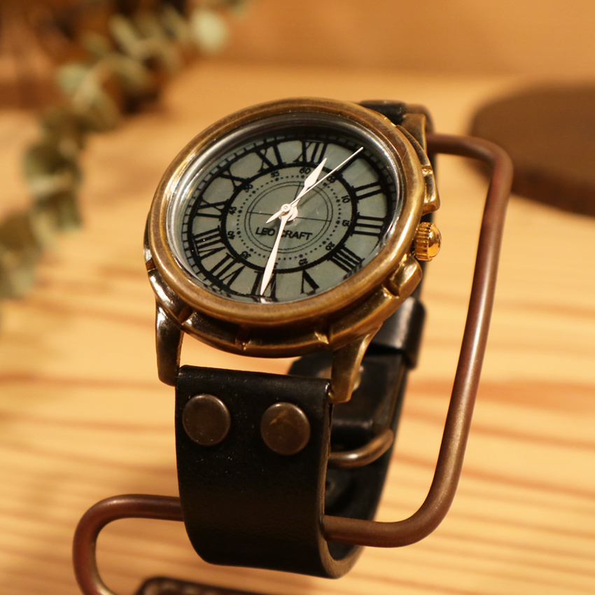 意図的に真鍮のサビ(緑青)を発生させ、色付けした時計。