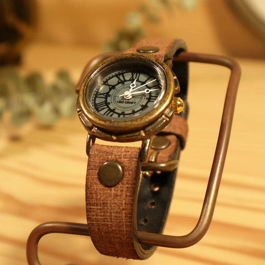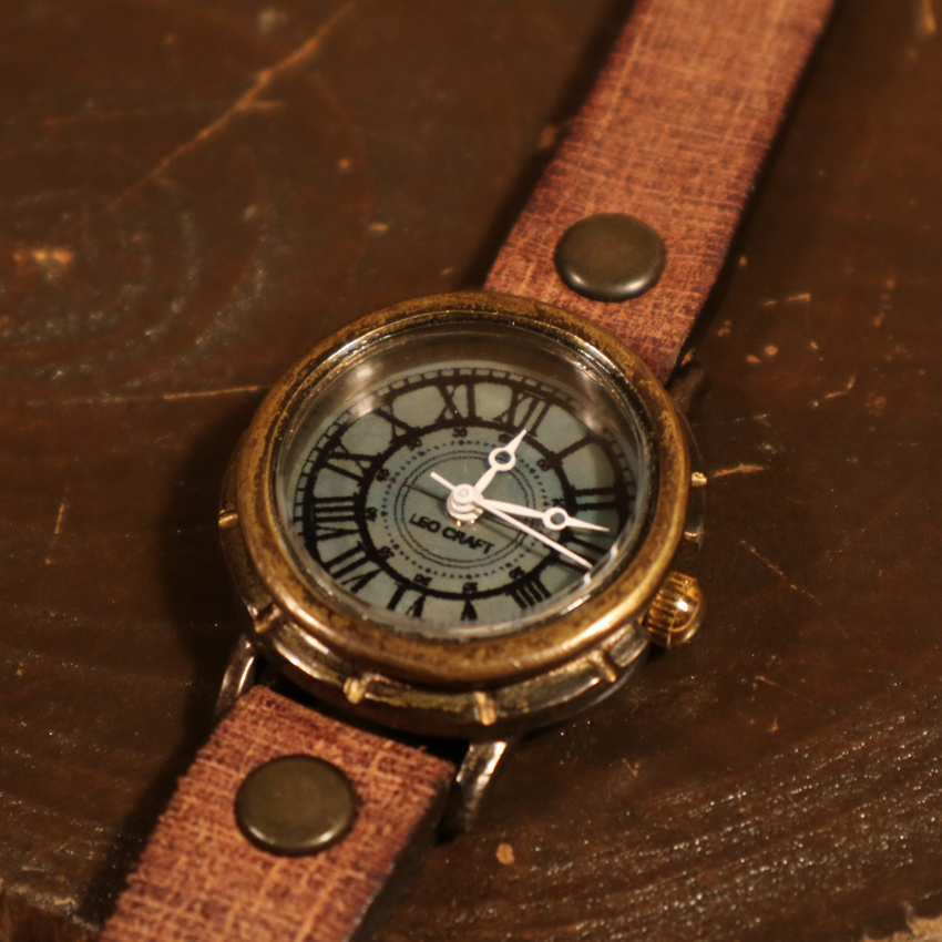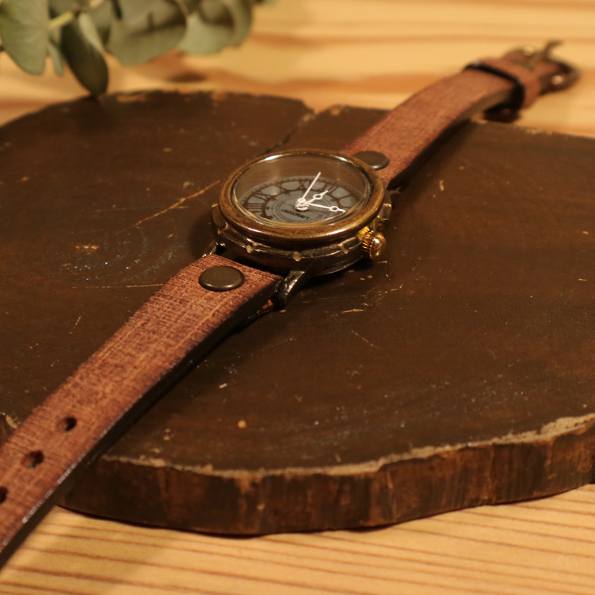 意図的に真鍮のサビ(緑青)を発生させ、色付けした時計。