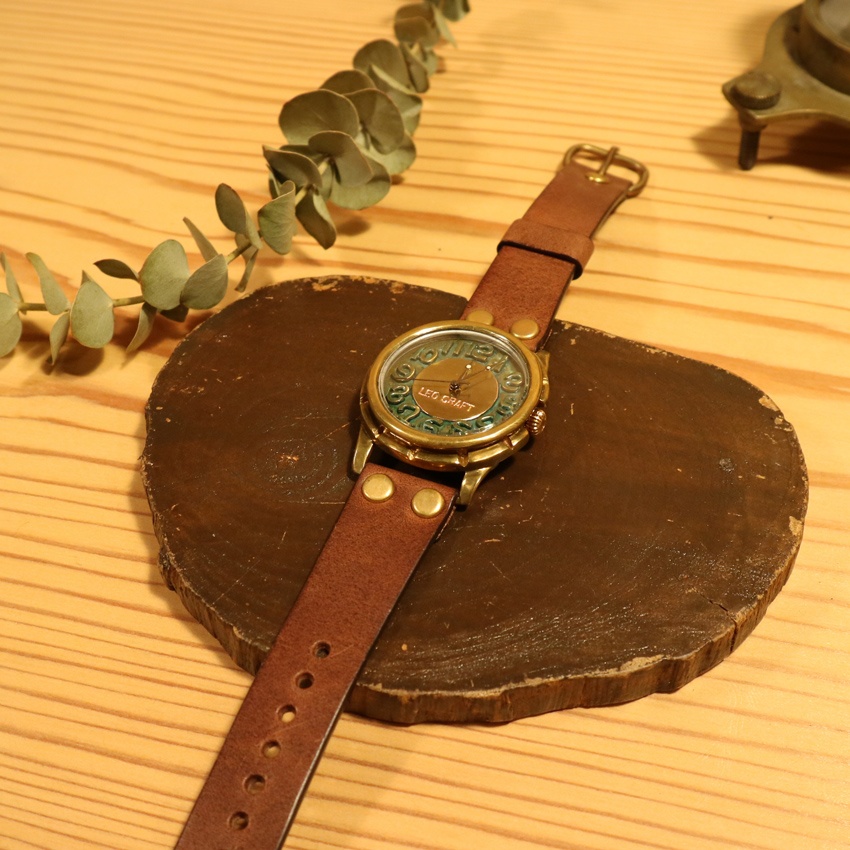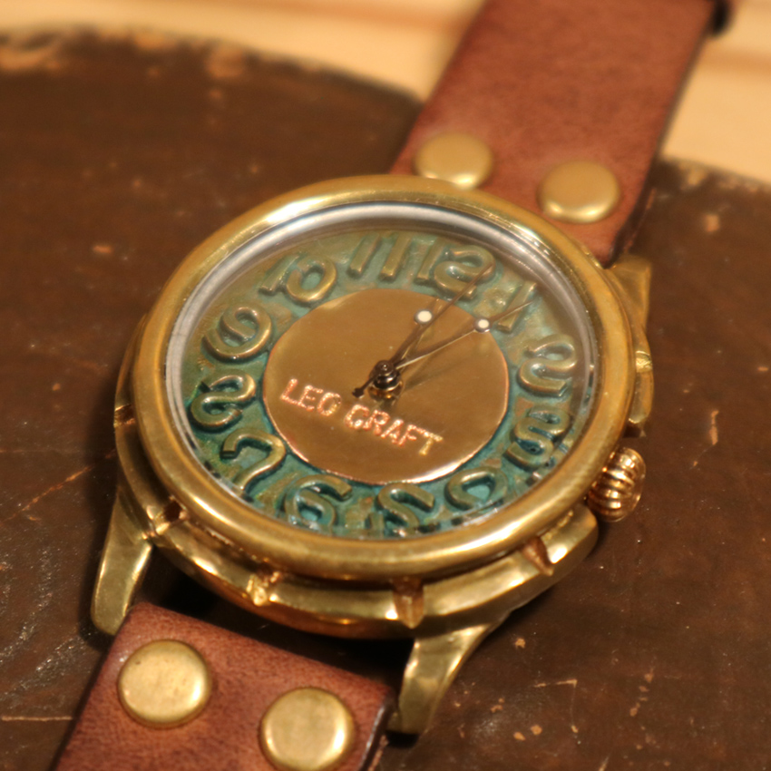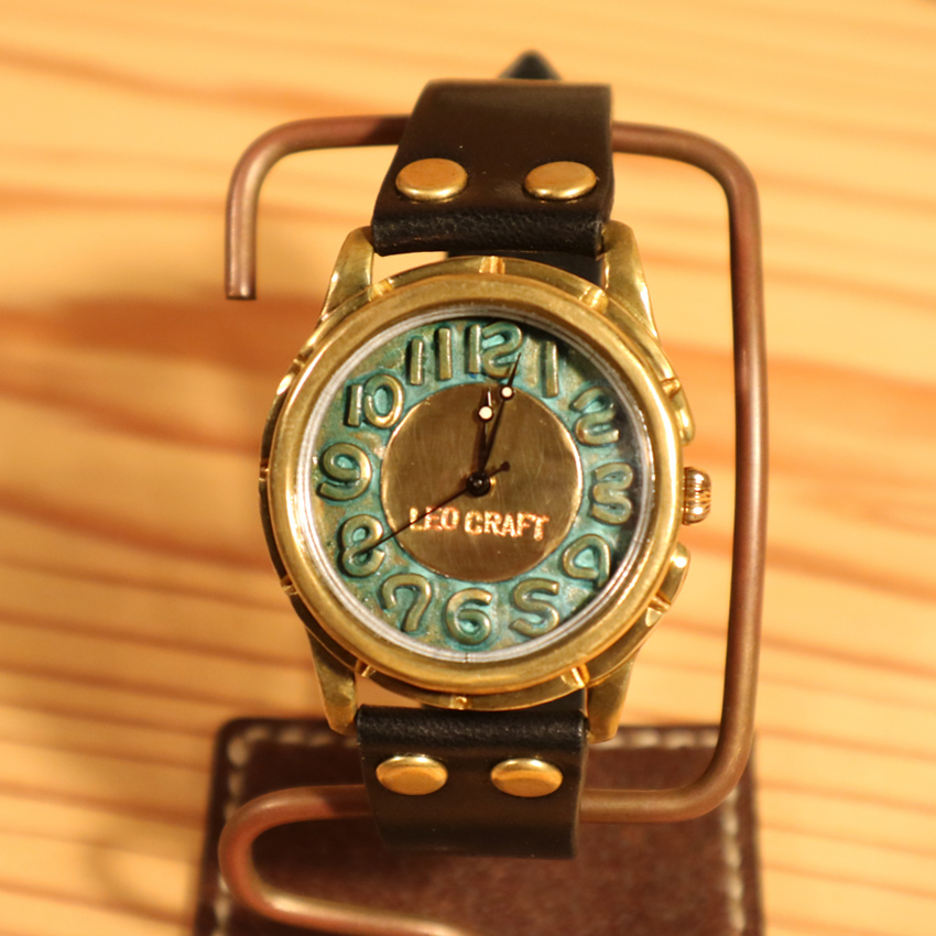 意図的に真鍮のサビ(緑青)を発生させ、色付けした時計。