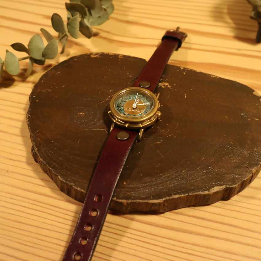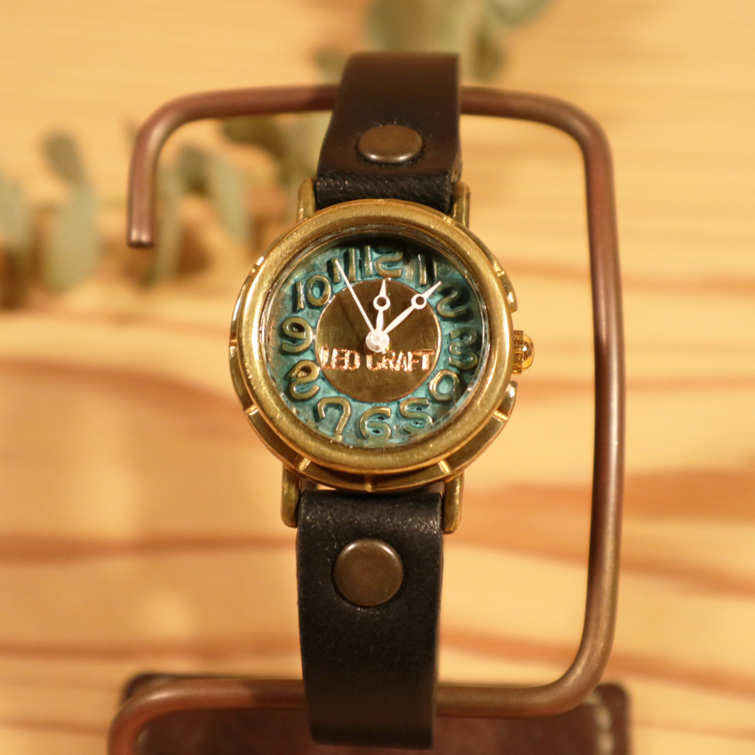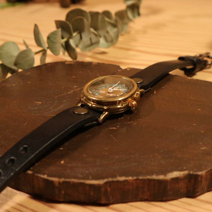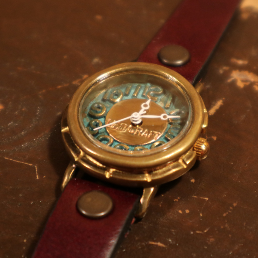 意図的に真鍮のサビ(緑青)を発生させ、色付けした時計。
