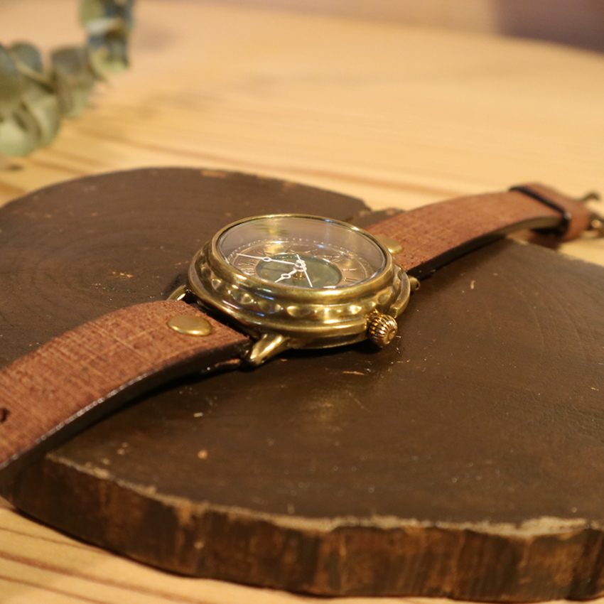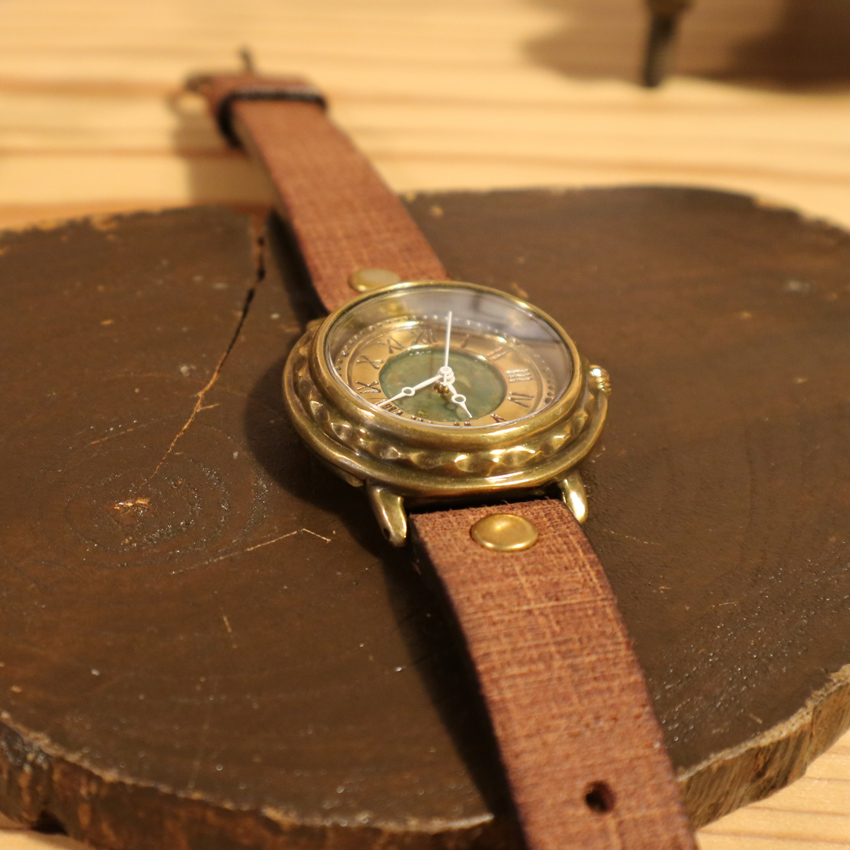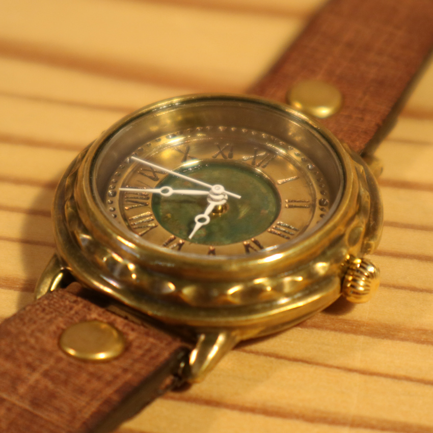 意図的に真鍮のサビ(緑青)を発生させ、色付けした時計。